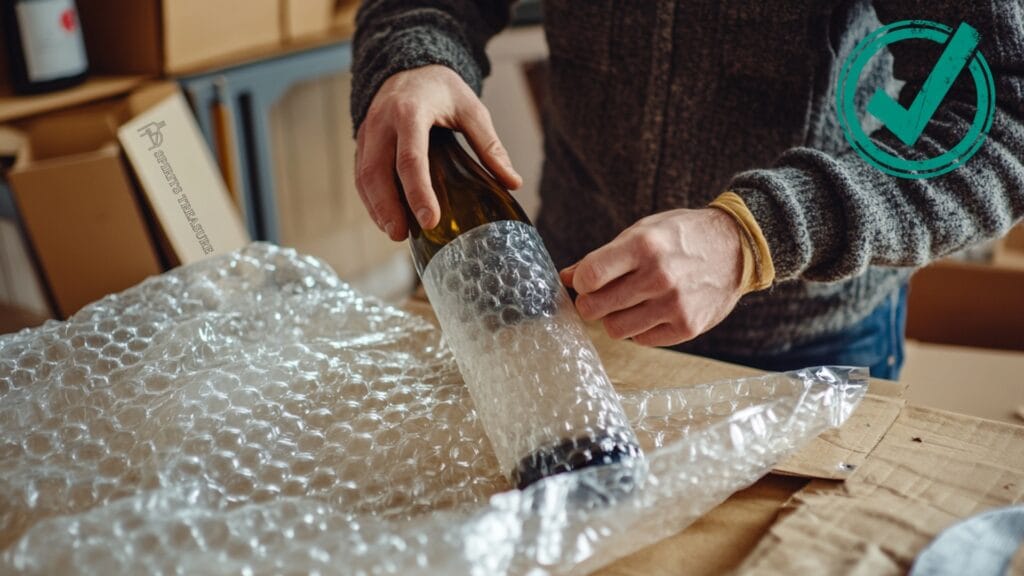 Wrap each bottle in bubble wrap, paying extra attention to the neck and bottom to avoid direct contact with other items.